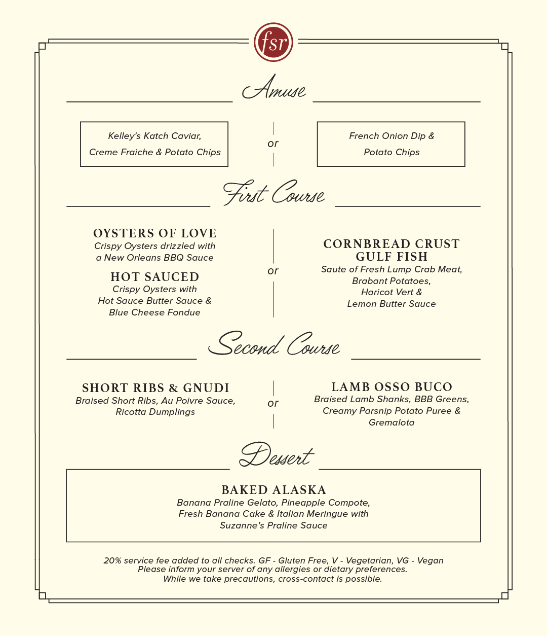 Celebrate New Year’s Eve at Felicia Suzanne’s with a special multi-course dinner featuring seasonal flavors, Gulf seafood, and comforting Southern favorites — finished with a festive dessert to send you into the new year right.
